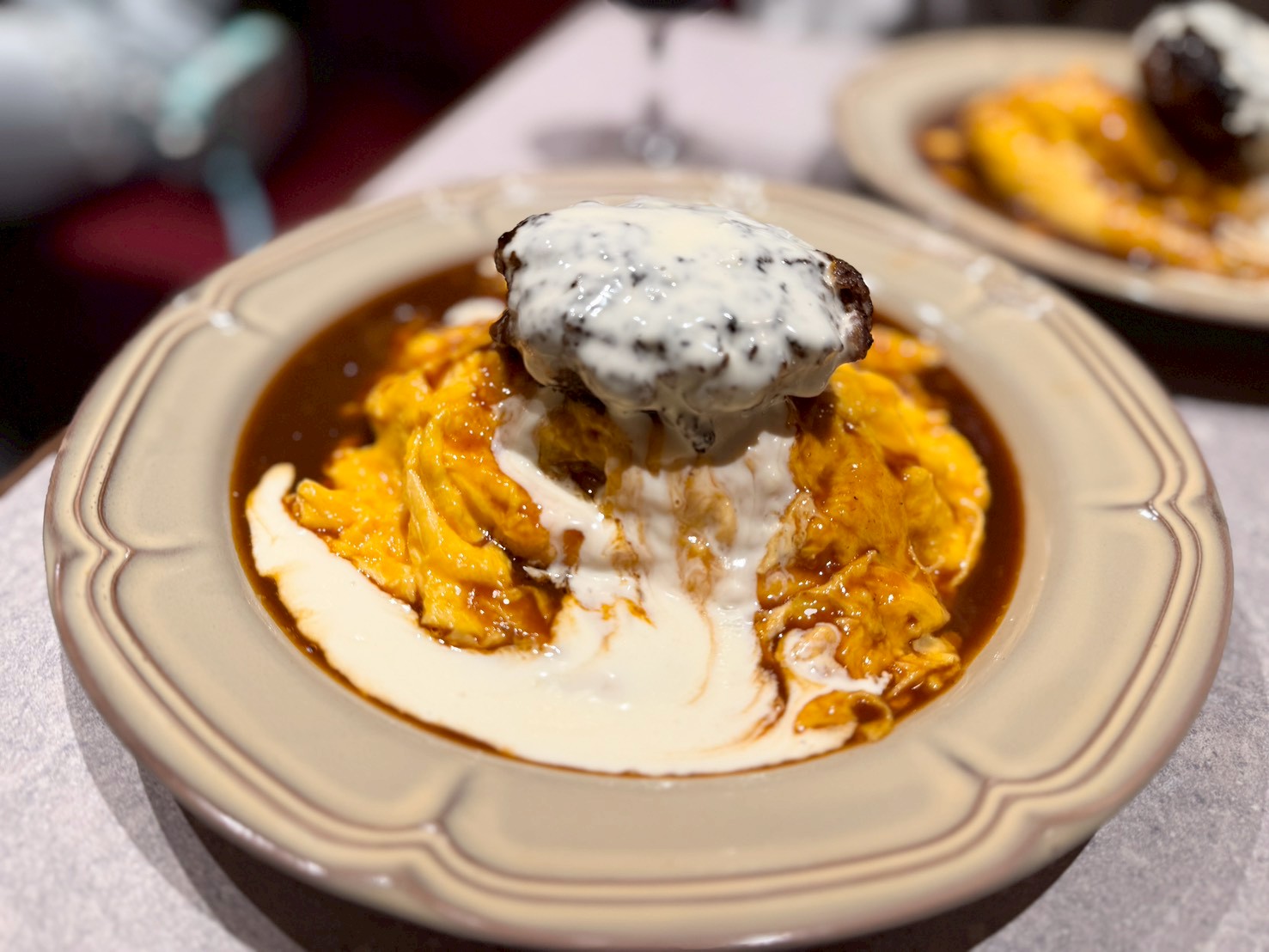ふわふわのオムライスの上にハンバーグとたっぷりのチーズソース。