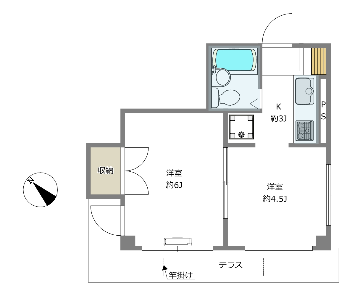 | 間取り | 2K(洋室:約6.0帖・4.5帖/K:約3.0帖) |