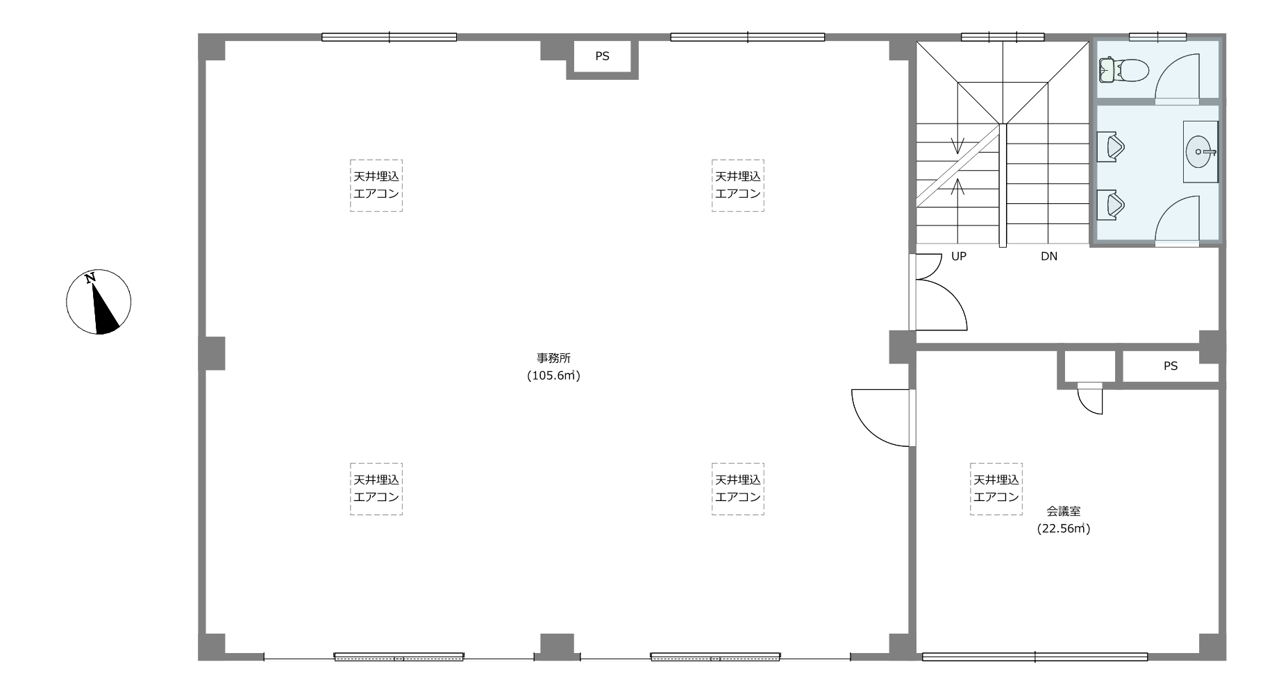 | 間取り | ワンルーム(事務所:約105.60㎡/会議室:約22.56㎡) |